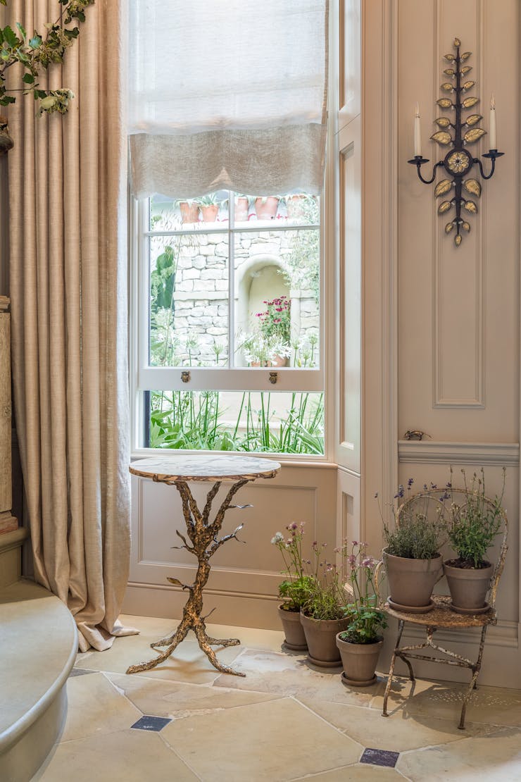 The WOW!house Entrance Hall draws inspiration from the sanctuaries of great artists, expansive, light-filled spaces where creativity and classical architecture coexist in quiet tension. While working on a project in Antibes, Victoria was struck by the château where Picasso once worked: an 18th-century structure filled with ornate detail, yet used boldly as a space for making, not merely preserving. She describes it as “respected but not revered.” That balance between historical gravitas and artistic freedom became central to the design of the room and welcomed in art and sculpture from Richard Zinnon’s paintings loaned by Cadogan gallery and Sophie Sellu’s carved wooden pieces – Victoria imagined these to be whittled from the woodland floor on this mythical property.