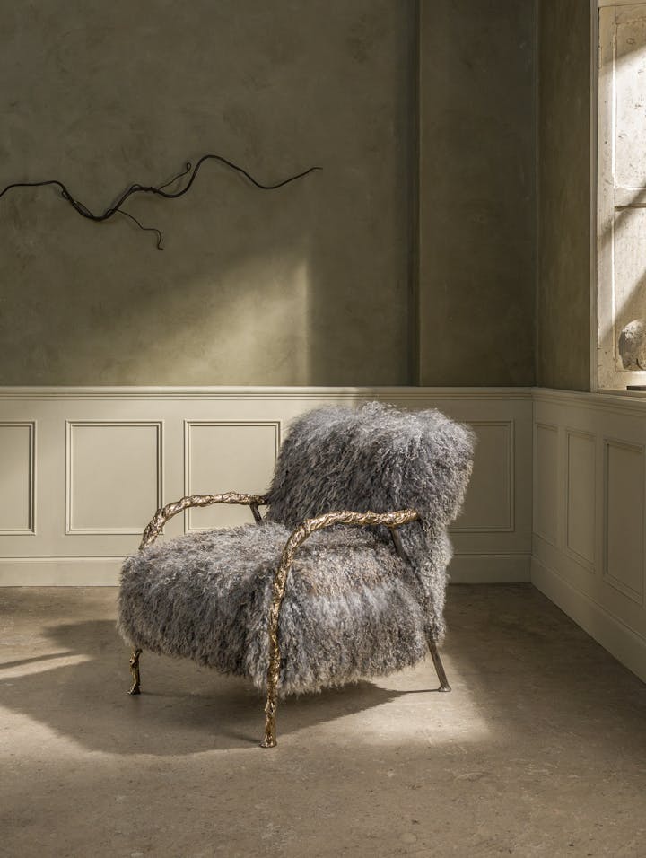 A visceral and animated chair designed and sculpted by Christopher Cox combines concepts of both animal and plant life. The meandering cast bronze "vines" form unusual but surprisingly comfortable armrests. Supported by a raw, forged iron frame, the seat and backrest is traditionally upholstered in luxurious Gotland lamb’s fleece, ensuring exceptional comfort while enhancing its unique aesthetic.