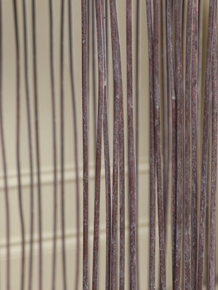 This unique vision for a dressing table was realised in the artists' London studio. A curving curtain of forged-iron "reeds" envelopes the sitter, rolling gracefully into scrolls that flank the central drawers. Topped with characterful Pippy Oak—recognised for its distinctive imperfections, known as cat's paws—with a softly moulded edge. The metalwork base is unified in the artists' mottled, misty-pink patina.