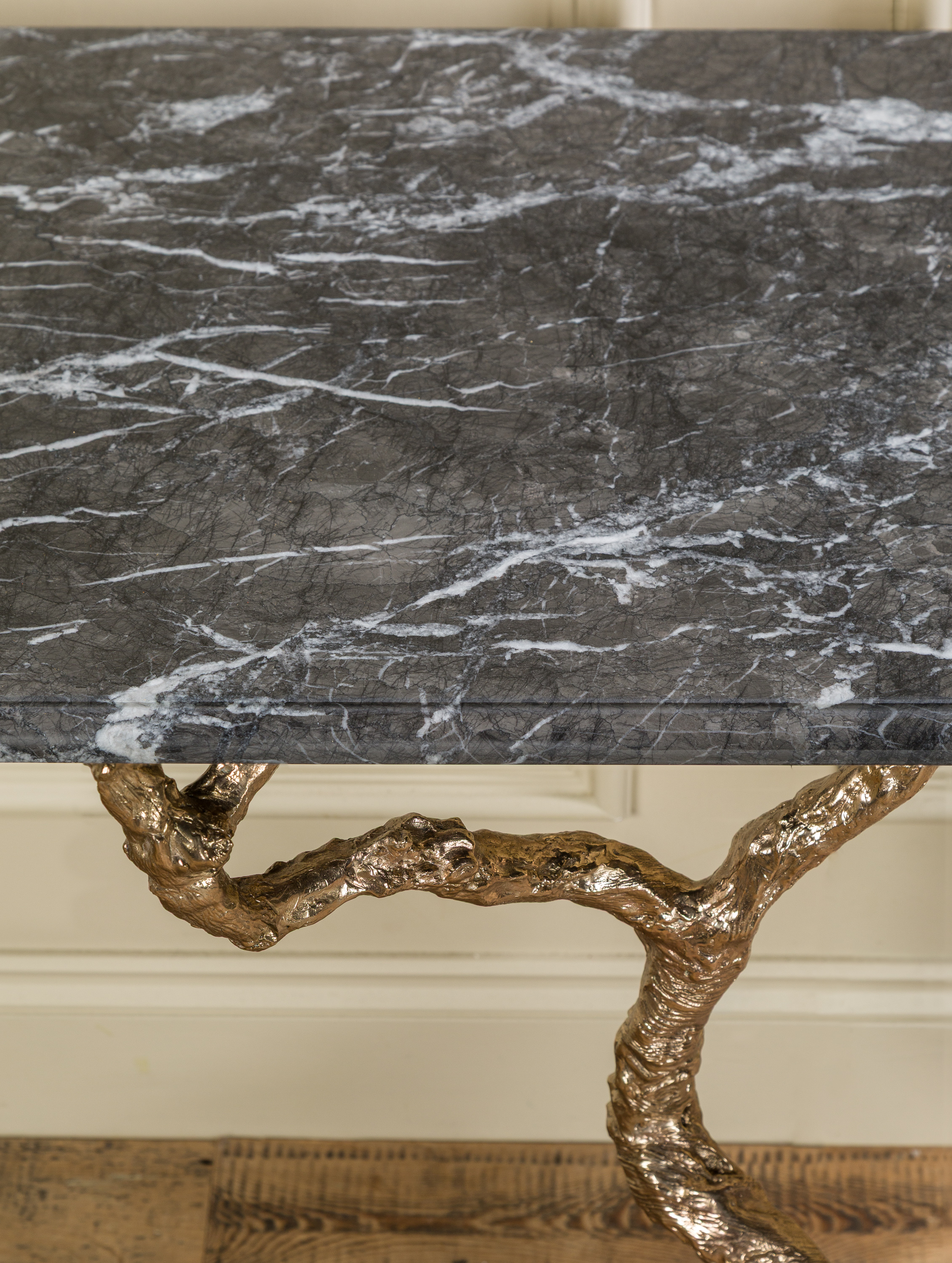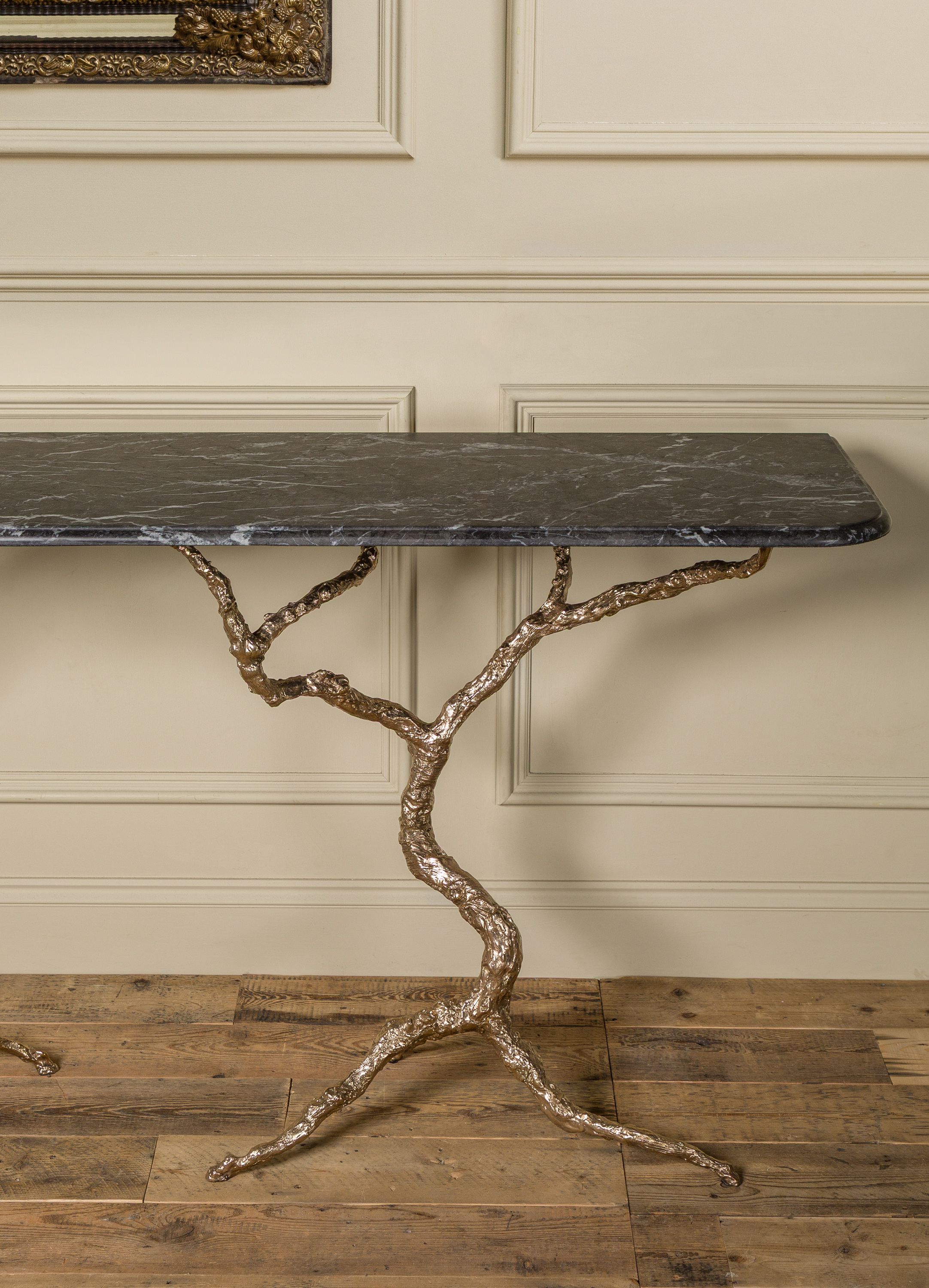 A generously proportioned bronze console table inspired by the "Aeneid" and Aeneas's quest to bridge the worlds of life and death in search of the golden bough. Branches of warm golden bronze support a dark Nero Marquina top, evoking timeless elegance while alluding to both the natural world and the metaphysical journey Aeneas seeks to traverse.