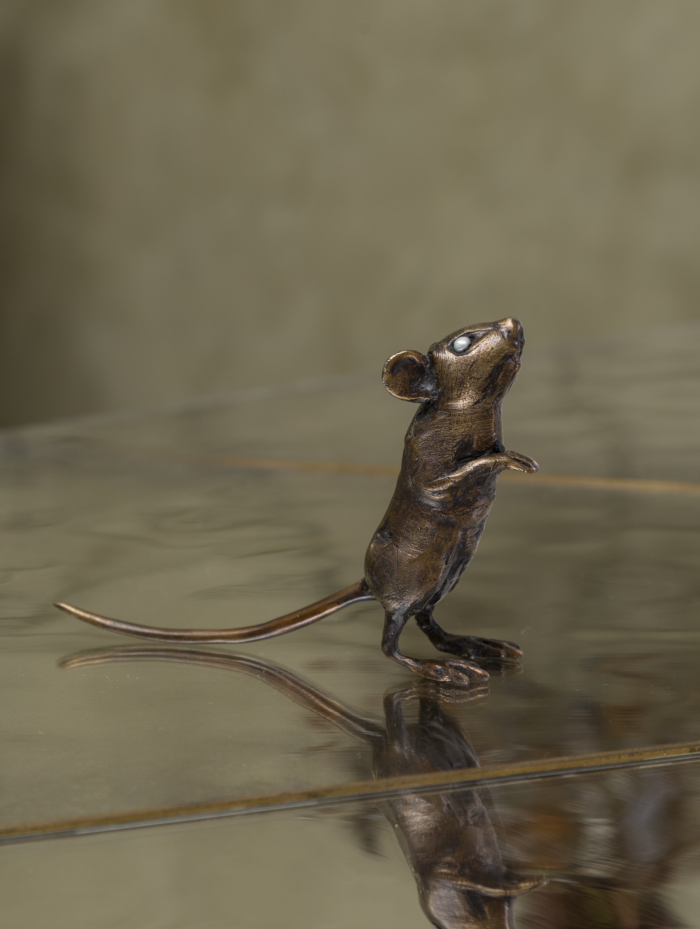 Sculpted by the artist, this inquisitive mouse, is cast in bronze, patinated white and set with pearl eyes. The piece balances refined craftsmanship with a spirited, mischievous presence.
