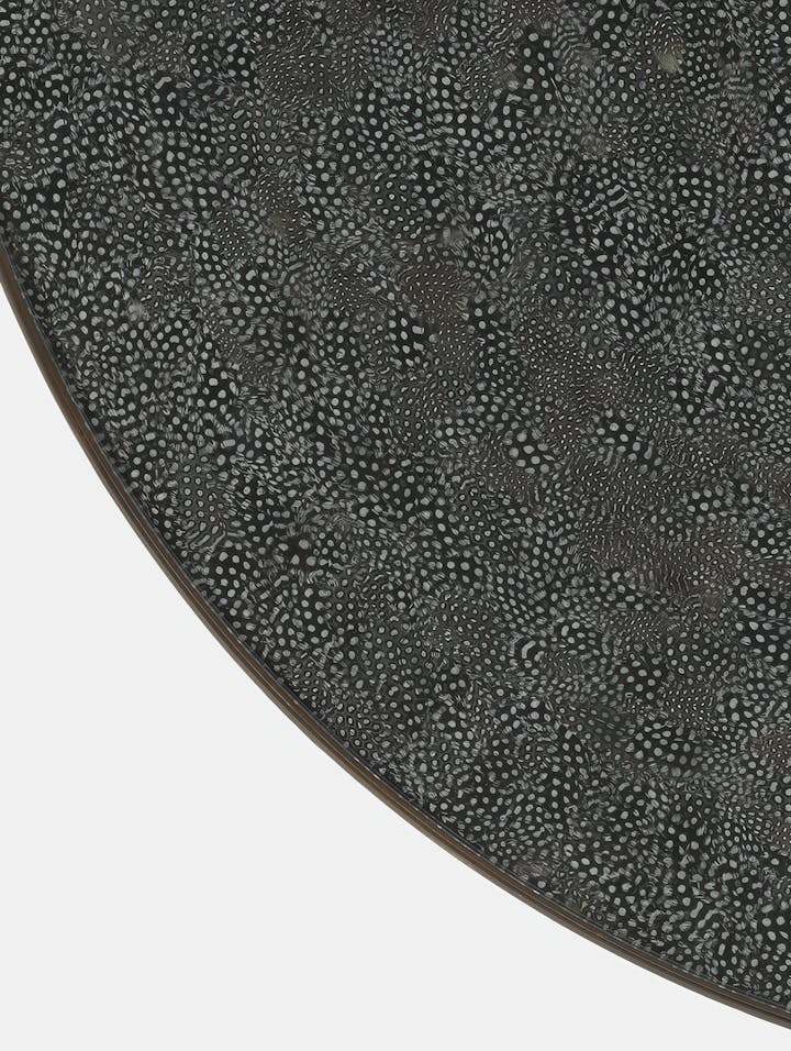 A sculptural centre table inspired by fragmentary Roman marble legs, like those in Sir John Soane’s Museum collection. The four monopodia legs, adorned with stylised lion heads and paw feet, support a distinctive tabletop made of Guinea fowl feathers under glass, secured by wrought iron banding.